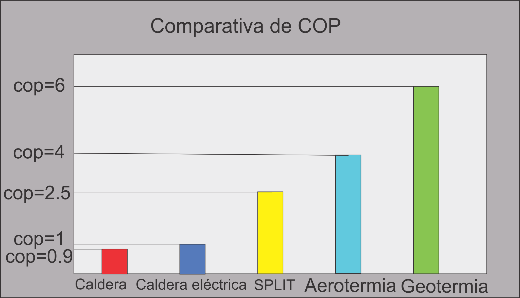 Este rendimiento se mide con el COP (Coeficiente de rendimiento), el cual nos indica cuanta parte de energía logramos por cada parte de enrgía que tomamos de la red, lo cual se traduce directamente en nuestra factura de servicios (luz y gas.)